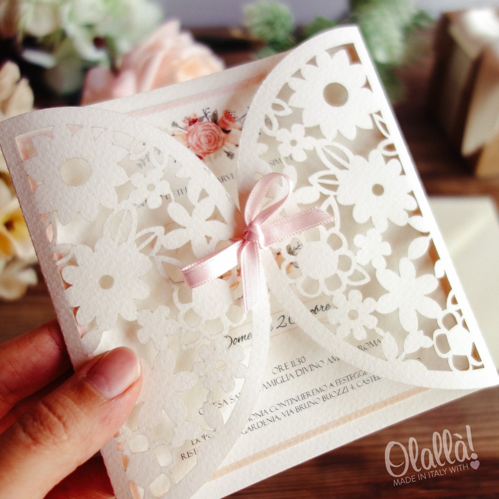 Invito Per Battesimo Con Carta Intagliata A Laser E Nastrino Colorato Olalla