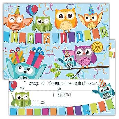 Partycards Set Di 12 Inviti Compleanno Biglietti Invito Per Festa Compleanno Per Bambini E Adulti In Italiano Gufi Allegri